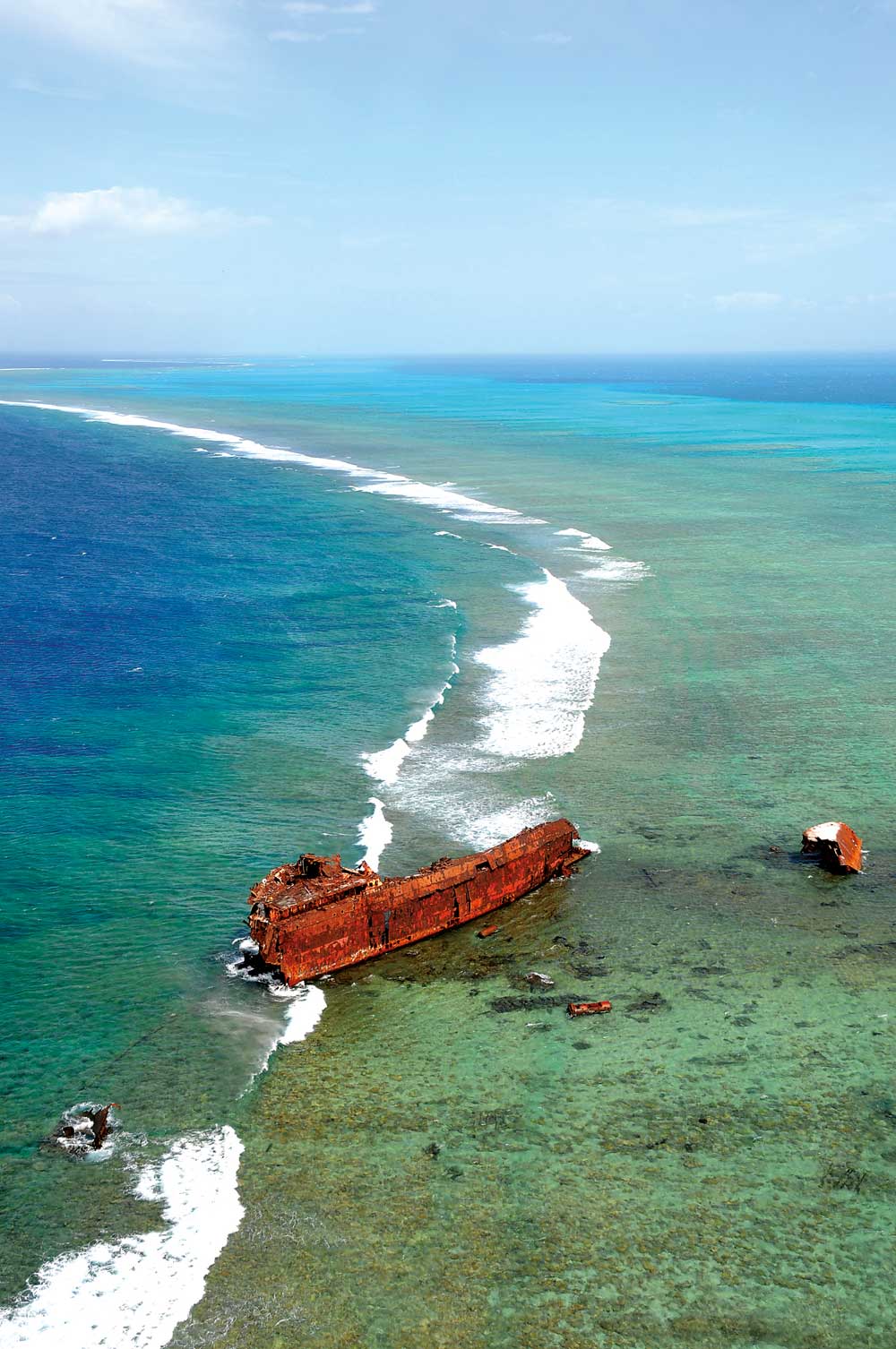 L'épave de l'Ever Prosperity perchée sur son récif depuis 1970.