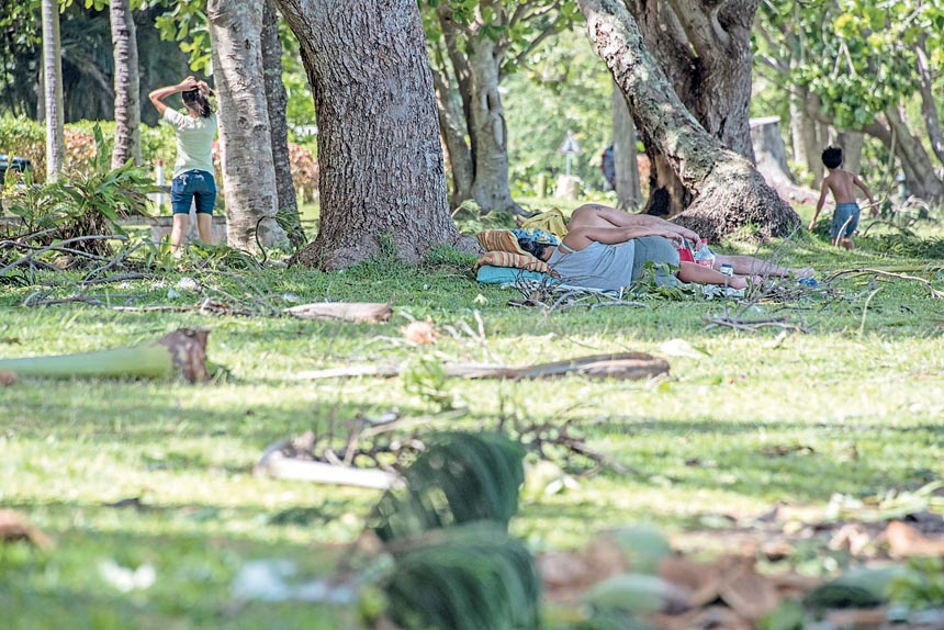 1 > Hier, en fin de matinée, la vie avait repris son cours. Entre les branches qui jonchaient le parc du Vallon-Dore, ces parents faisaient la sieste et leurs enfants en vacances s’amusaient avec les cocos tombés au sol.