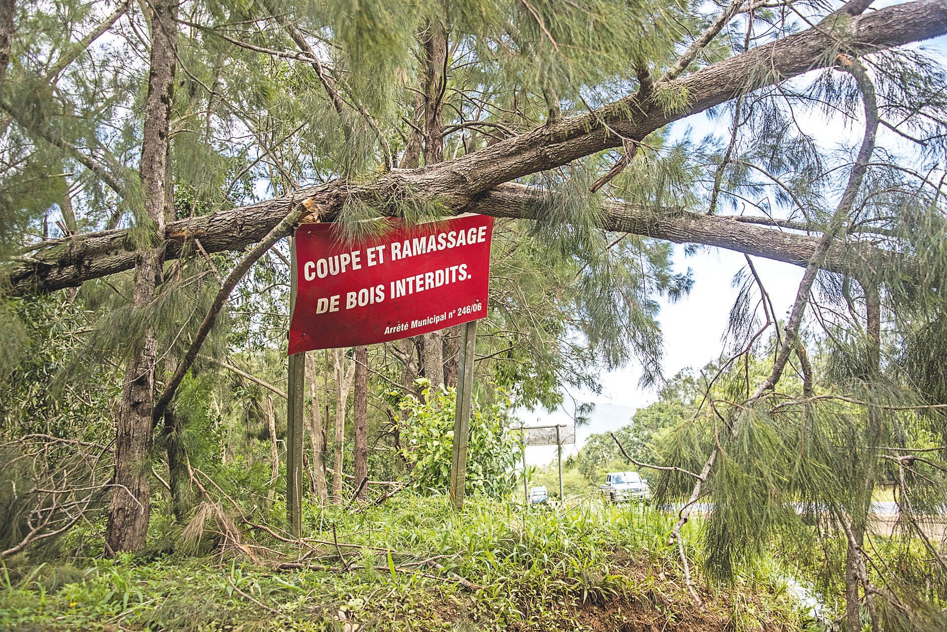 6 > Le cyclone Cook a fait à sa manière un pied de nez à la mairie du Mont-Dore en entraînant la chute d’un bois-de-fer sur ce panneau d’interdiction, à hauteur du lotissement Ranch.