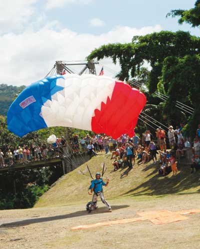 Jean-Pierre Lafay, parachutiste chevronné, a sauté dans le ciel lafoyen avec un parachute bleu-blanc-rouge et le drapeau américain attaché à la cheville, pour atterrir près de la passerelle Marguerite sous le regard attentif de nombreux spectateurs.