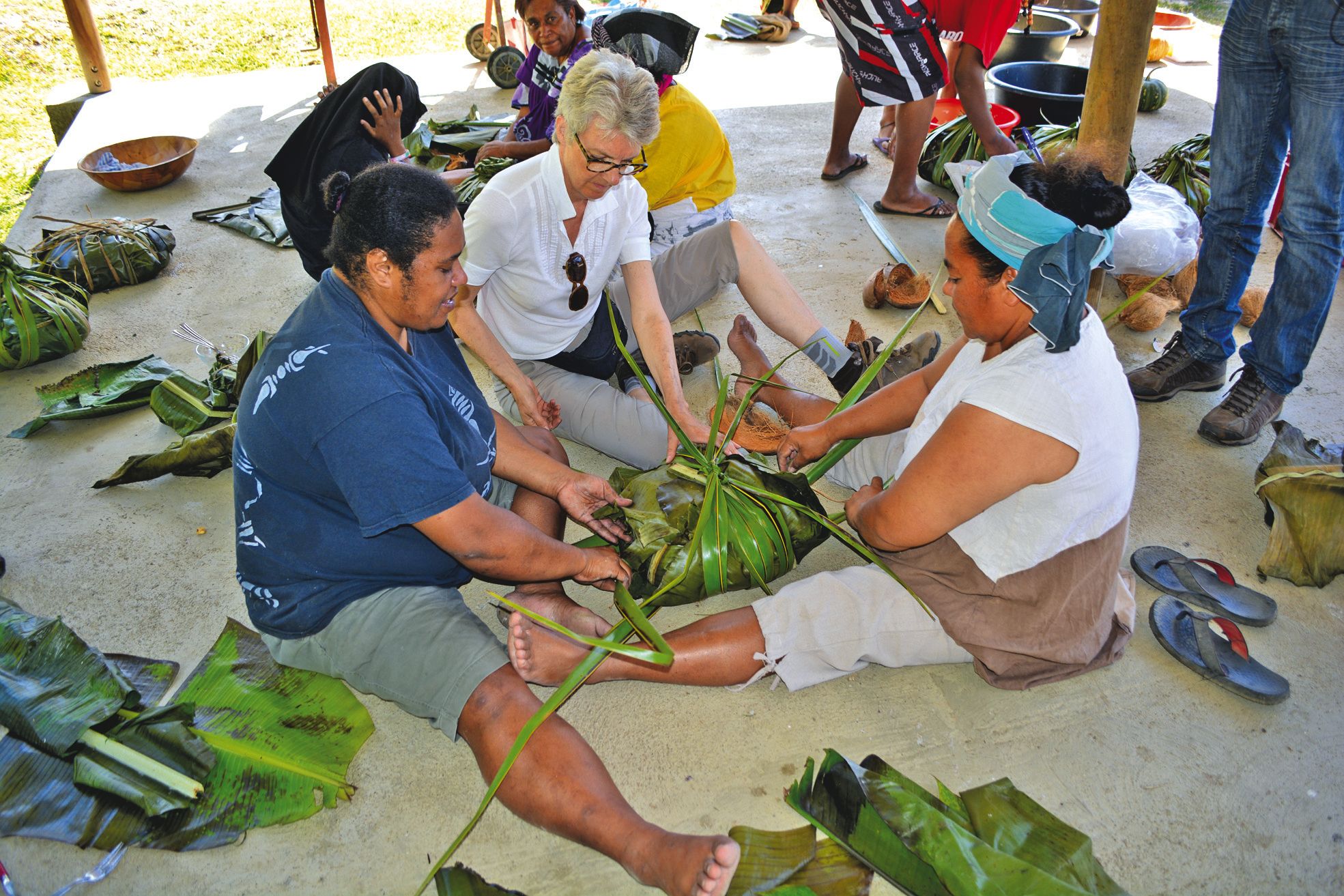 Aux côtés des mamans et des papas de la tribu, les visiteurs volontaires ont pu participer activement à la préparation et à la cuisson des quarante bougnas. Tout comme le four futunien, ces derniers ont été servis gratuitement dimanche à midi.