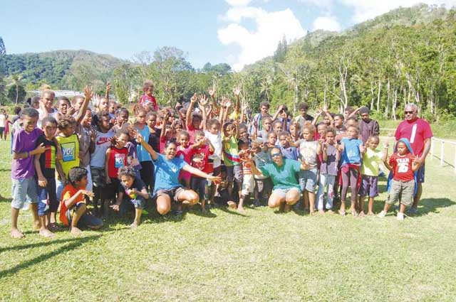 Tous les participants sont ici rassemblés avec les éducatrices du Comité provincial Nord des sports et loisirs, Mélissa en bleu, Linda en vert, et l’animateur communal, Jean-François Poma, à droite.