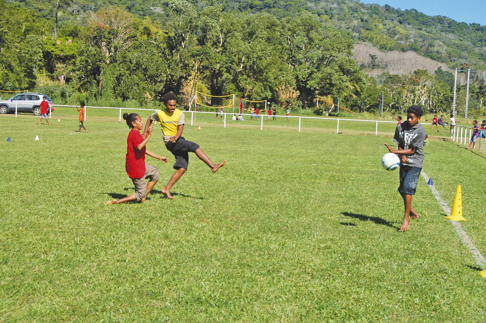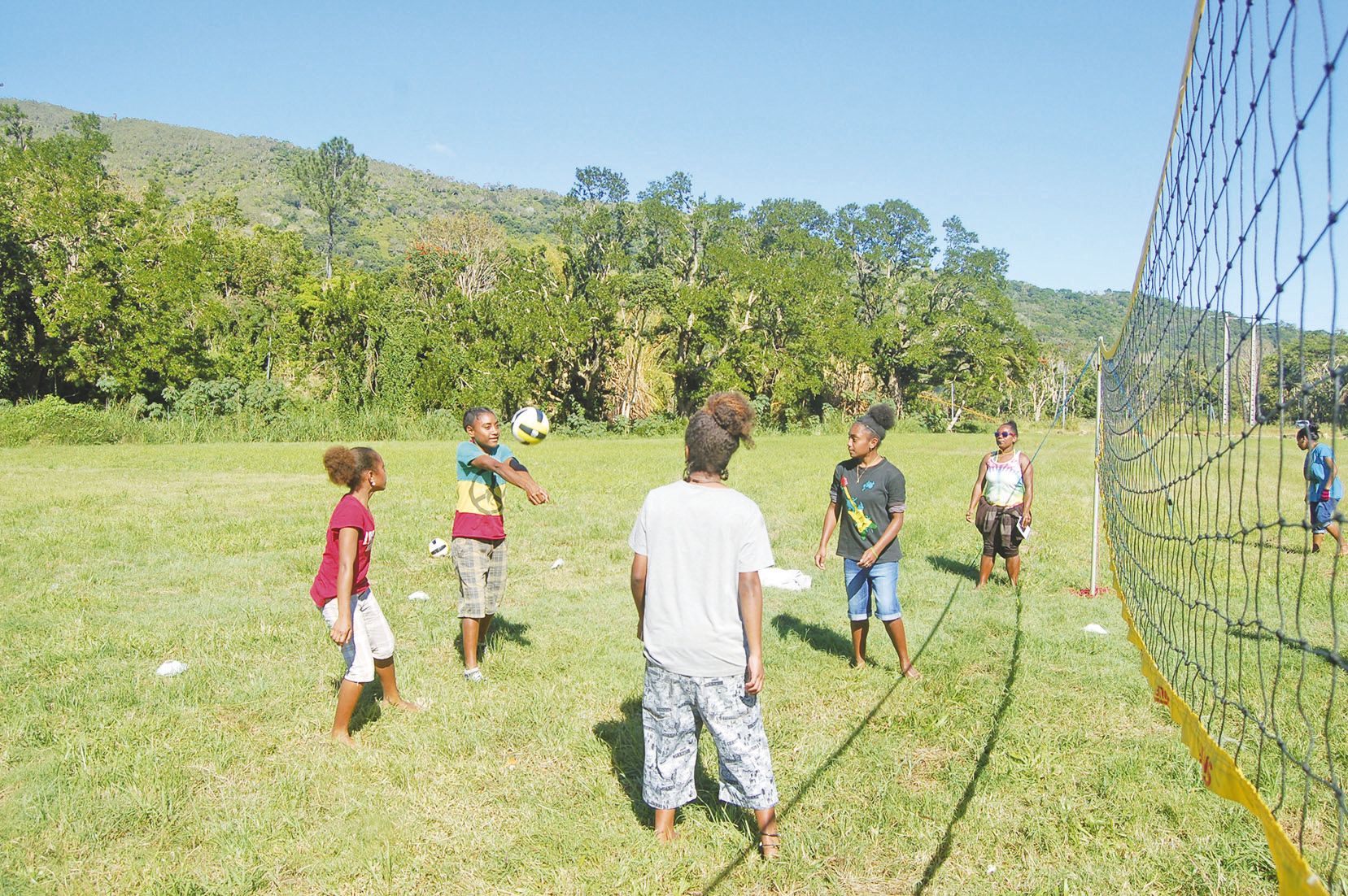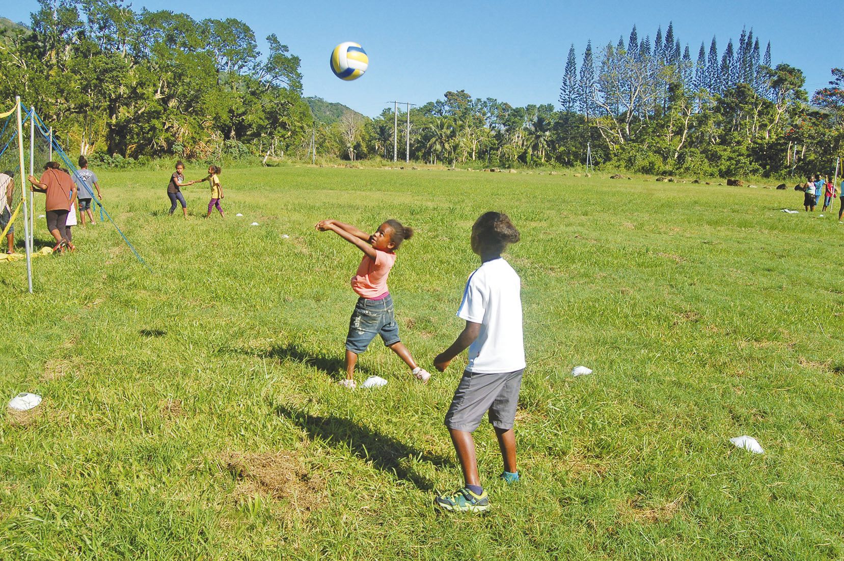 Pour les plus petites, les matches de volley-ball se jouent à deux contre deux, sur un tout petit terrain. Douze équipes féminines étaient engagées. Les qualifiées sont : en 7/9 ans : Dahlia de Tchamba et Tiaré de Goa. Pour les 10/12 ans : Cagou 1 de Tchamba et Hibiscus de Mou. En 13/15 ans : Cordylines de Goa et Orchidées de Mou. Et en 16/18 ans : Brésil et Notou de Tchamba.