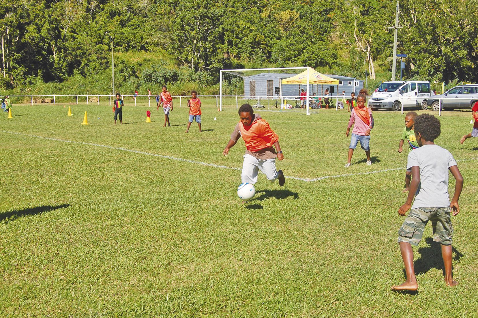 Dix équipes de football mixtes se sont rencontrées. Les qualifiés pour la finale de district sont, par ordre de classement : en 7/9 ans, Tonnerre de Tchamba et Frégates de Mou. En 10/12 ans : Pigeons verts et Cerfs de Tchamba, ici en photo, avec une remontée de balle des Cerfs. En 13/15 ans, Grondu et C. de Tchamba. Et en 16/18 ans, Naliguy et Hibiscus de Tchamba.