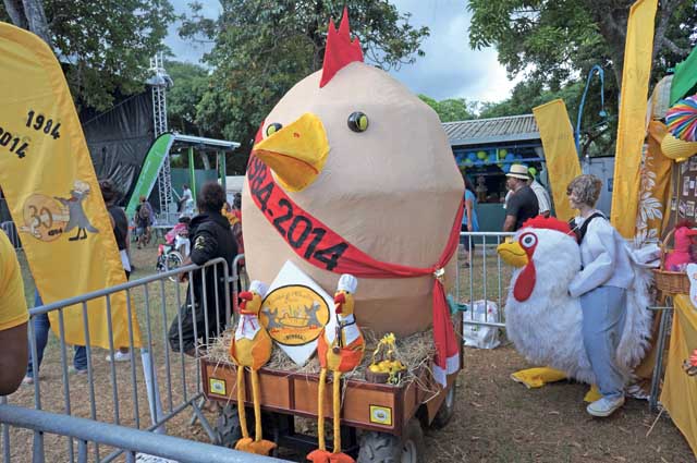 Pour les 30 ans de l’omelette géante, à Dumbéa, la confrérie a bâti cette poule. A moins que ce ne soit un œuf ? Toujours vivante, elle subit les dégâts du temps en attendant d’être, peut-être, à nouveau la star de la fête. La confrérie possède un costume de poule, une vraie mascotte, mais l’emploi semble difficile à porter, et le costume reste au garage.