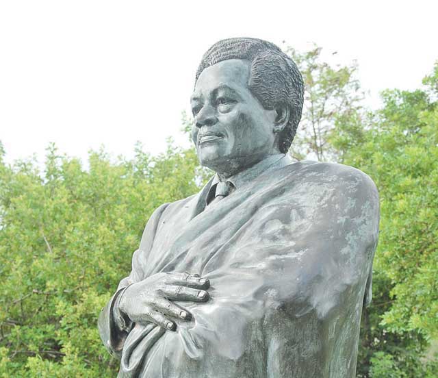 Roger Laroque, homme d’affaires devenu directeur général des établissements Ballande en Nouvelle-Calédonie, est surtout connu pour avoir été le maire de la capitale pendant trente-deux ans, de mai 1953 jusqu’à sa mort, le 18 novembre 1985. C’est en sa mémoire que Jean Lèques, son successeur, installe cette statue en fonte à l’entrée de l’hôtel de ville, en 1986.