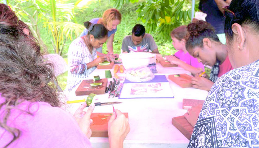 Afin d’attirer un nouveau public, un atelier de sculpture sur fruits et légumes était délivré par Alexandra, à l’ombre d’un tivoli dans les jardins.