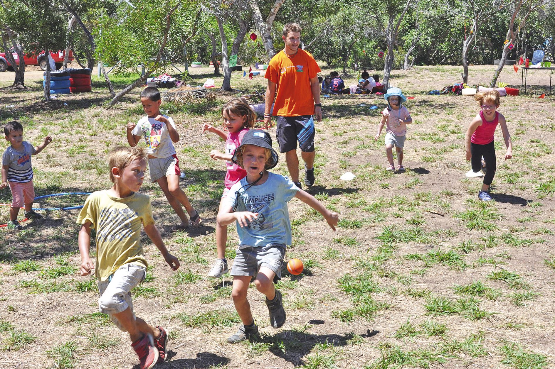 Les petits âgés de 3 à 6 ans ont testé le parcours sportif mis en place par Jérémy, leur animateur. Ils devaient franchir la rivière en sautant sur des cailloux symbolisés par des cerceaux, puis plusieurs passages jalonnés par des coupelles, tout en portant une balle ou une noix de coco en équilibre. Dans un autre jeu, les enfants-lapins devaient traverser à découvert la clairière sans se faire cueillir par la balle du chasseur.