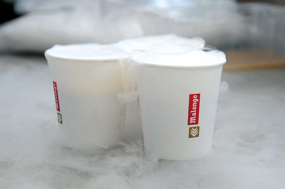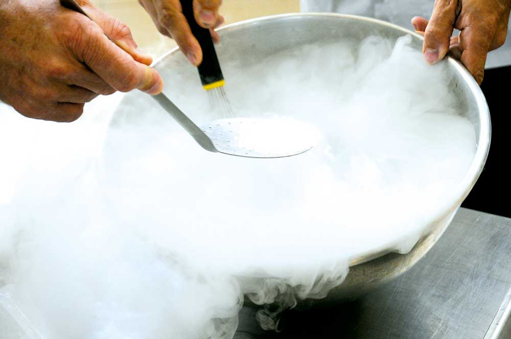 Des molécules plein la cuisine ; le 12/06/2012 - 20:51De la fumée se dégage en versant de la glace carbonique sur le jus de letchi pour préparer un granité.