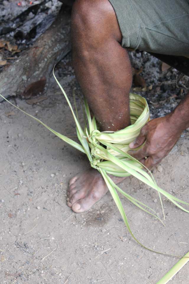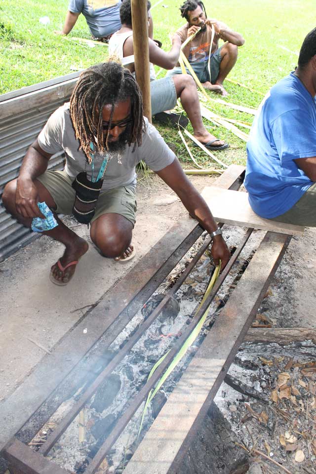 Après avoir été découpées, les feuilles de cocotiers sont passées quelques secondes au-dessus du feu afin d'être séchées. C'est cette opération qui leur permet de produire un son.