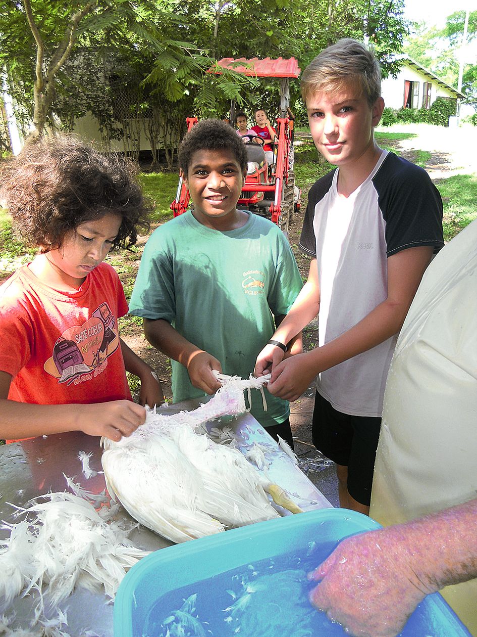 Mercredi, c’était le jour de l’abattage des canards. Les enfants ont mis la main à la pâte pour déplumer les volatiles, avant de les déposer en chambre froide, en pensant fortement à vendredi, le jour où ils seront consommés le midi.