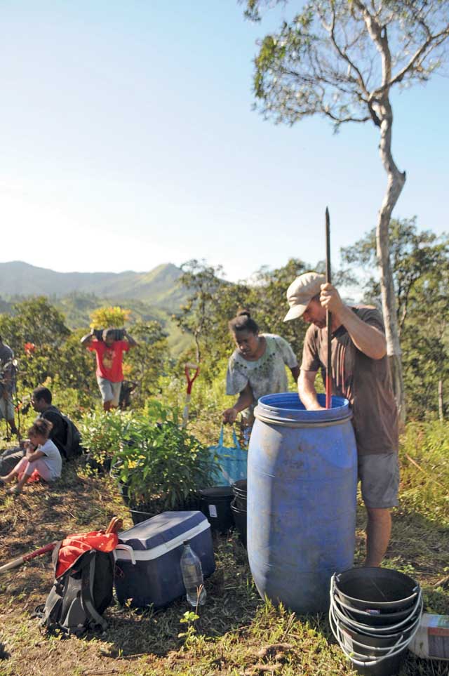 Gohapin, vendredi 15 avril. Volontaires de la tribu et bénévoles de l'association WWF assistent à une démonstration sur les techniques de plantation.Gohapin, vendredi 15 avril. Volontaires de la tribu et bénévoles de l'association WWF assistent à une démonstration sur les techniques de plantation.Photos. J. D.
