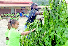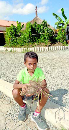Trévis, élève en CP, a présenté le tubercule à ses camarades, qui a été planté lors de la construction de la case.