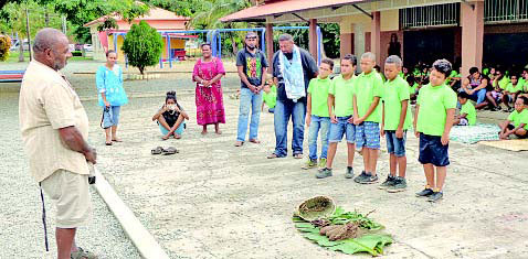 Pour accompagner l’igname, Selefen Stacey a assisté les petits pour ramasser du chou kanak et remettre l’ensemble, lors de la coutume, à Georges Assao, le président de l’aire Xârâcùù.