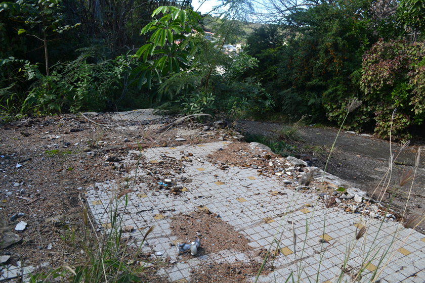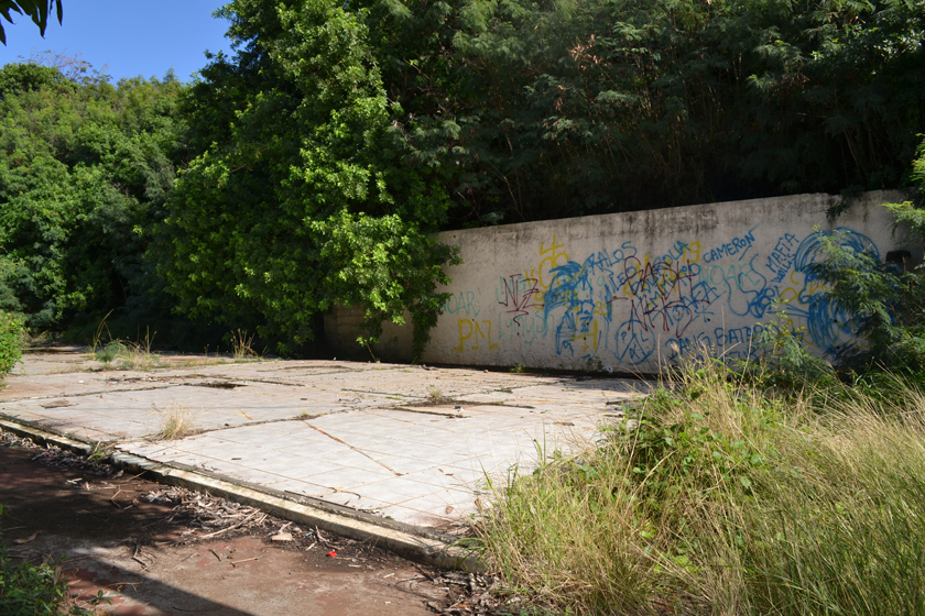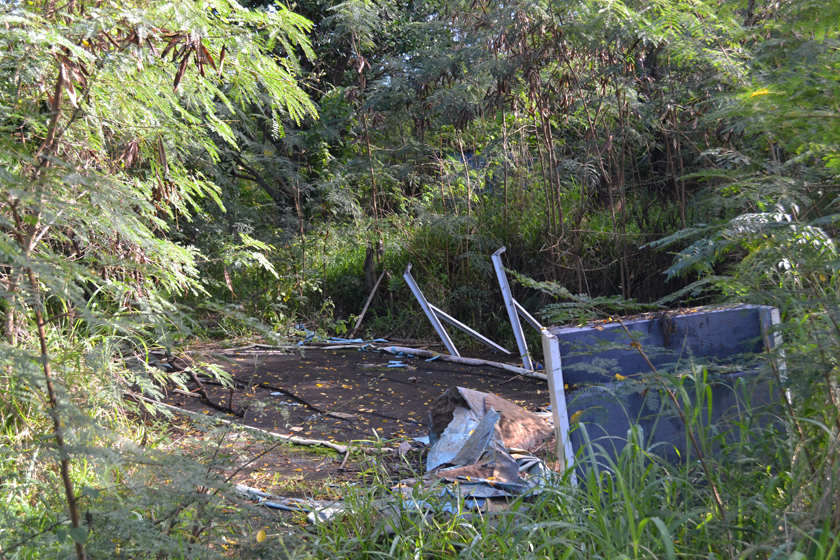 En pleine brousse, dans les arbres, les restes d'une piscine hors sol. Un paysage de désolation. Difficile d'imaginer son état originel.