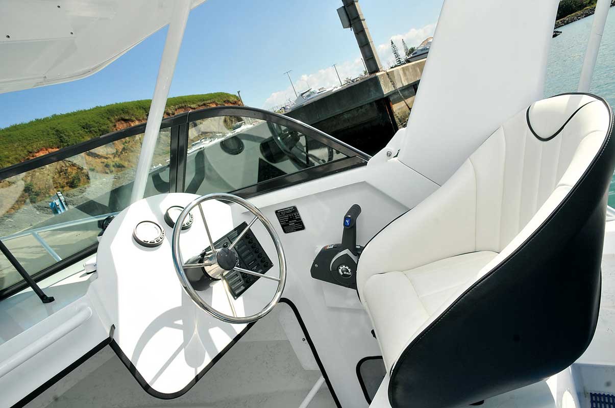 Le poste de pilotage comporte un fauteuil réglable avec une sellerie de qualité et une barre hydraulique qui permet de guider le bateau au millimètre. Le pare-brise est en verre Sécurit.