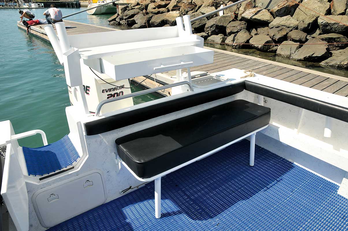 Parmi les accessoires, une grande banquette amovible, une table à découper avec tiroir, et un portillon avec accès à l'échelle de bain.