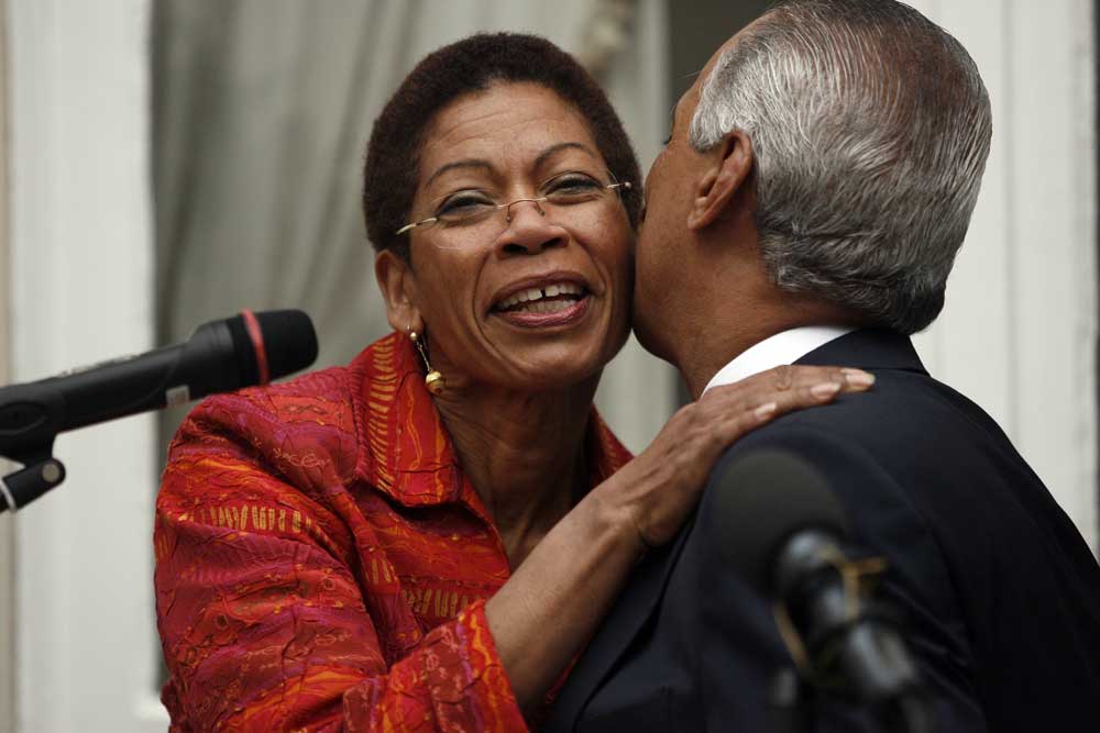 George Pau-Langevin, ministre des Outre-mer ; le 04/03/2014 - 10:41George Pau-Langevin et son prédécesseur Victorin Lurel lors de la passation de pouvoir, rue Oudinot, à Paris.
