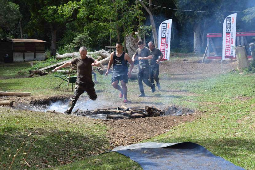 A l'arrivée, le dernier obstacle est de sauter par-dessus un feu.