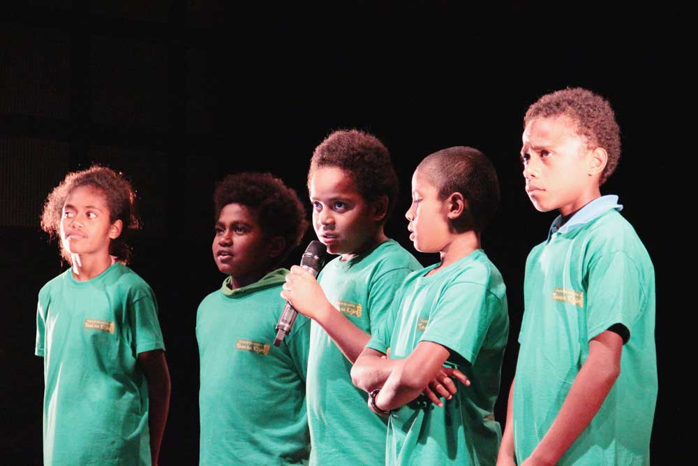 Les jeunes conteurs de Canala (Séraphin, Sokay, Stéphan et Mitou), ici sur scène.