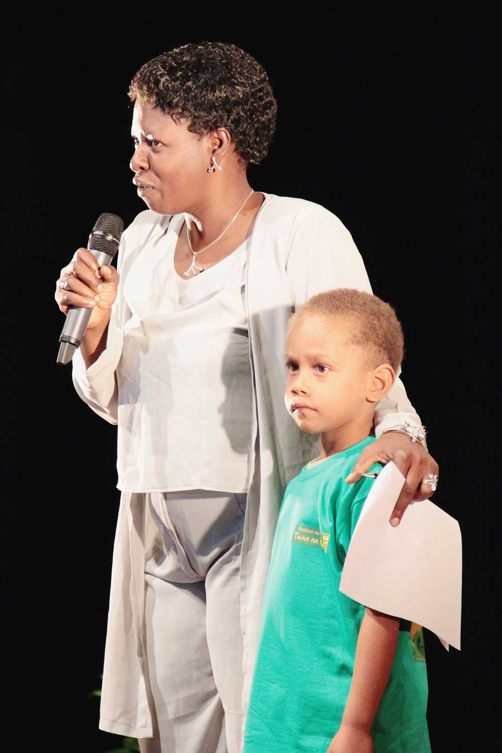 Mariam Koné présente le plus jeune conteur, Rivaldo, 6 ans, de Poum.
