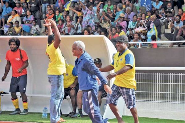 L’entraîneur d’Horizon Patho, Jimmy Waïa (en bleu), exulte après le deuxième but de ses joueurs, quatrièmes du classement.