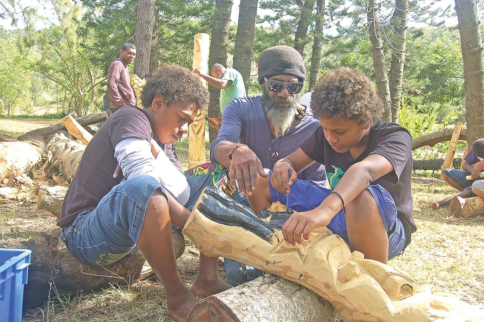 « Chaque année, on organise une semaine de ce type, indique Vanessa Doya, chargée de l’école. Au fil des ans, on a constaté l’intérêt des enfants pour cette résidence et des progrès dans le domaine du langage. Le projet en cours s’étale sur 3 ans, en partenariat avec le Centre de pratique musicale Mêrê â Gâârâ. C’est la seconde année. Le but est de sortir l’an prochain un livret de chants en ajië, créé et illustré par les enfants. » Ici, un groupe d’écoliers sur l’atelier teinture sur tissu, animé par Elise. Les enfants ont également eu des ateliers d’illustration et de fabrication de tapa avec les maîtresses.
