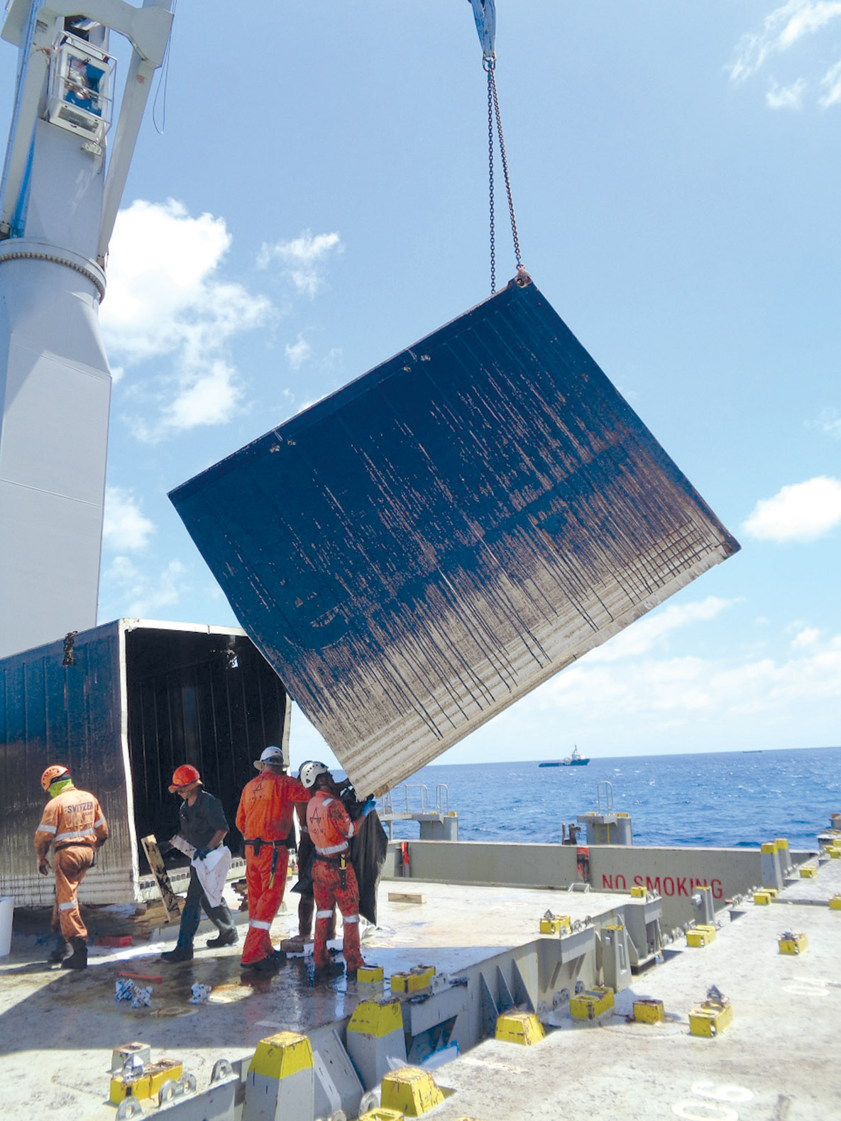 Des conteneurs, vides, sont déchargés, coupés en trois sections et transportés par hélicoptère vers une barge.