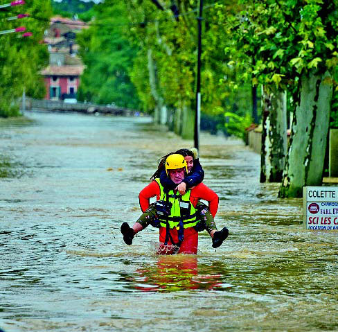 Un pompier assiste un jeune dans une rue inondée à Trebes. Photo AFP