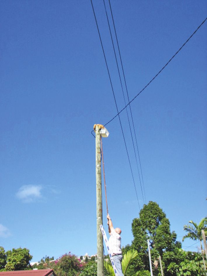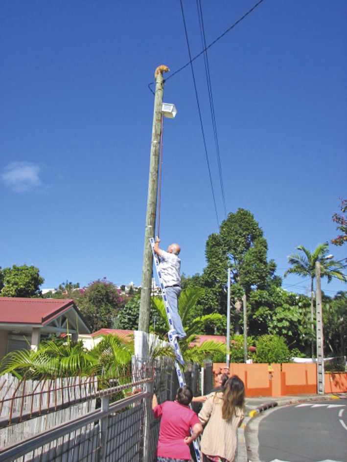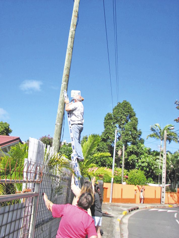 Robert a planté son échelle contre le poteau. Il a brandi une perche, prolongée d’un panier fourni par un commerce du quartier…