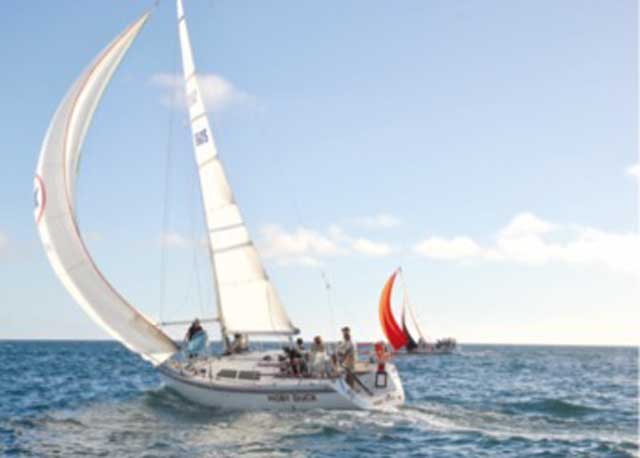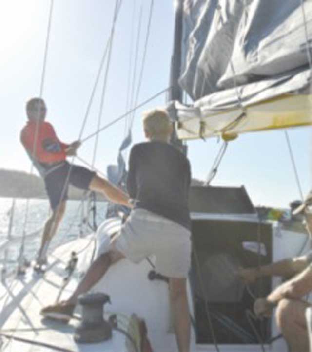Le retour de l’île aux Canards se fait d’une traite, sans le moindre virement. Keel Bill passe en tête. A bord, c’est le moment de détente. L’équipage fait seulement contrepoids et regarde les concurrents, les jambes sorties vers l’extérieur.