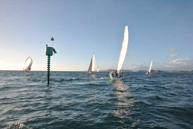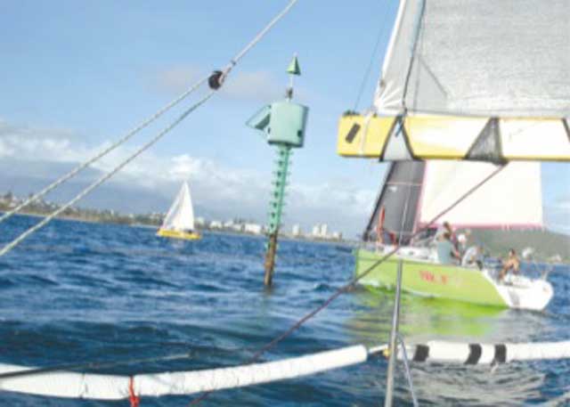 Les navires gagnent l’île aux Canards et virent à sa bouée verte. Deux trajectoires sont possibles. L’une proche de la terre, l’autre plus au large, pour aller chercher le vent.