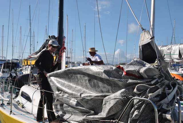 A la sortie du port, le skipper se met face au vent. La grand-voile et le génois sont hissés. De retour dans le vent, les voiles sont bordées et le moteur coupé.