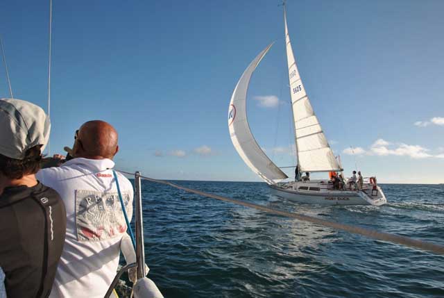De trois quarts arrière, les spinnakers sont de sortie. Conséquence directe, si les bateaux prennent de la vitesse, ils se mettent à déraper plus ou moins fortement de leur cap.