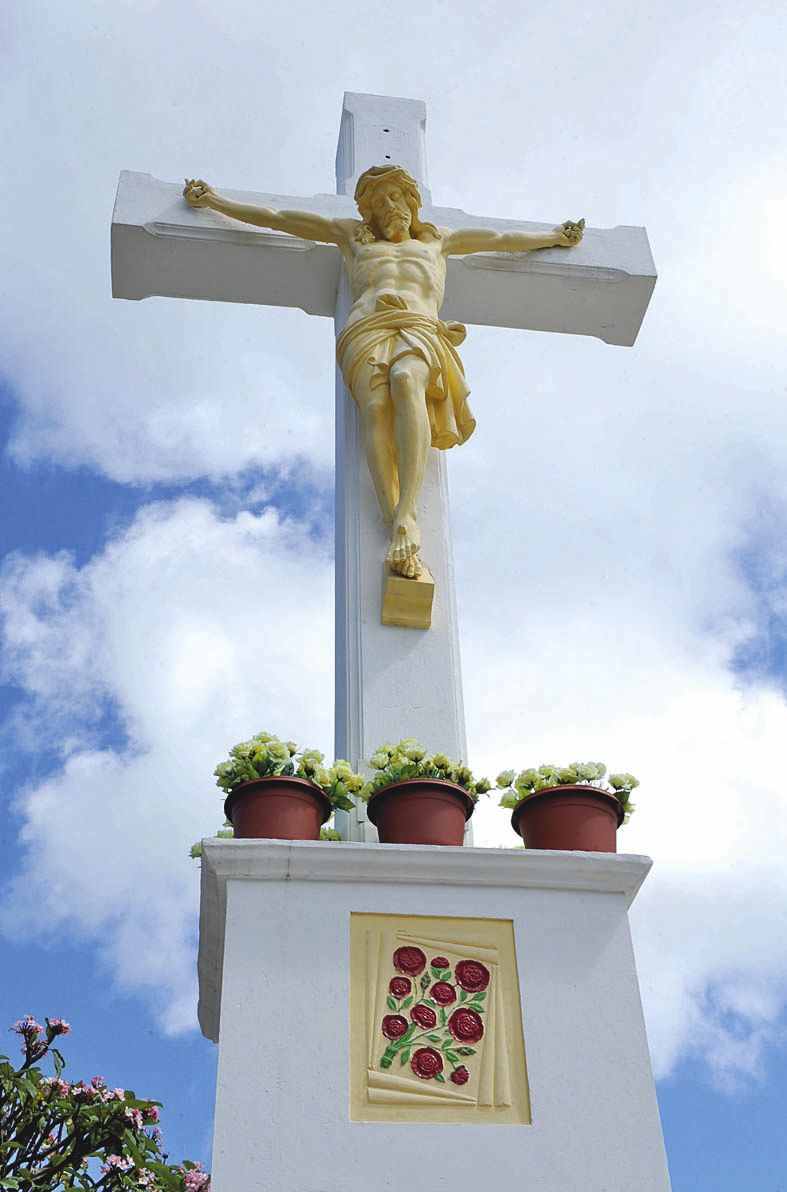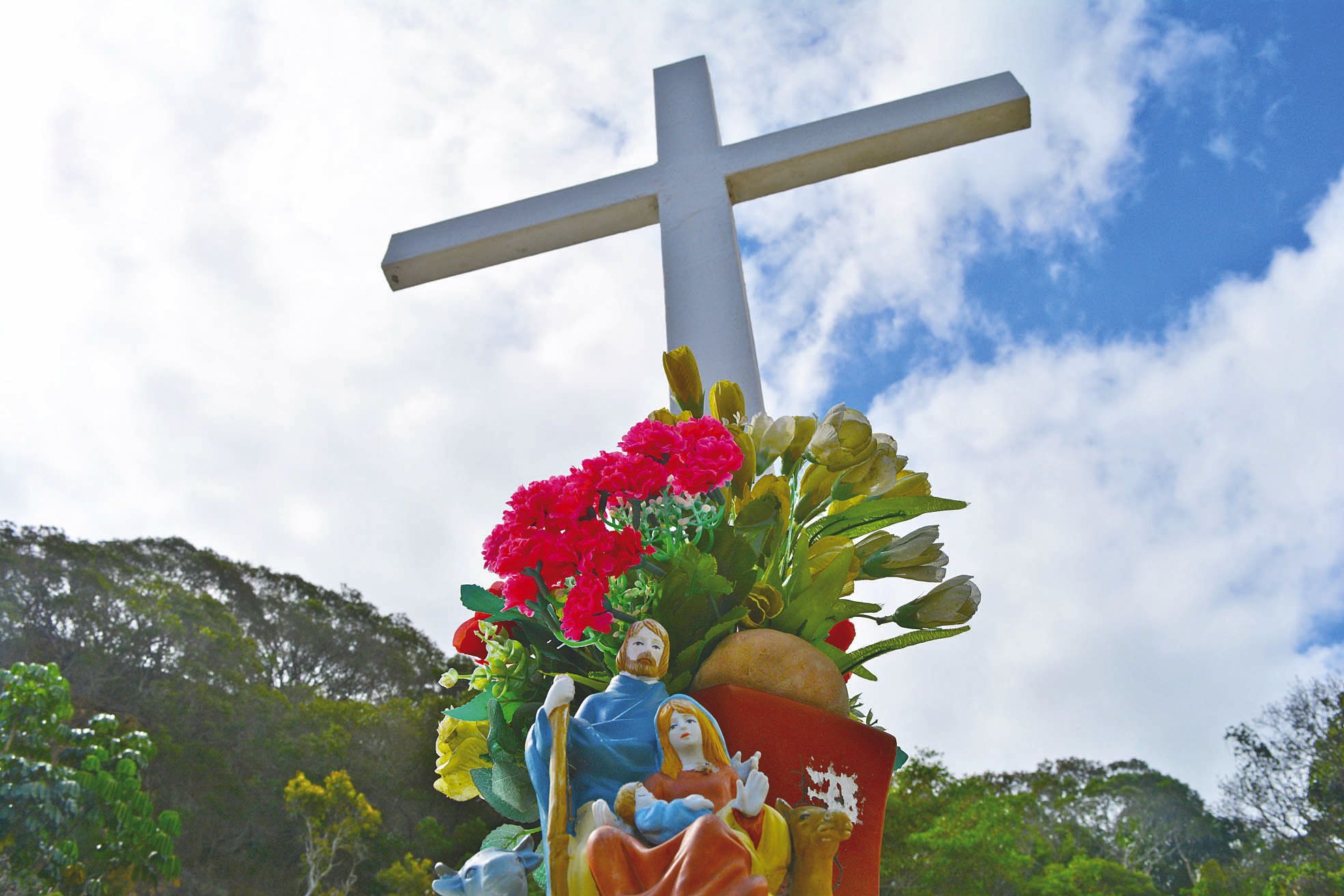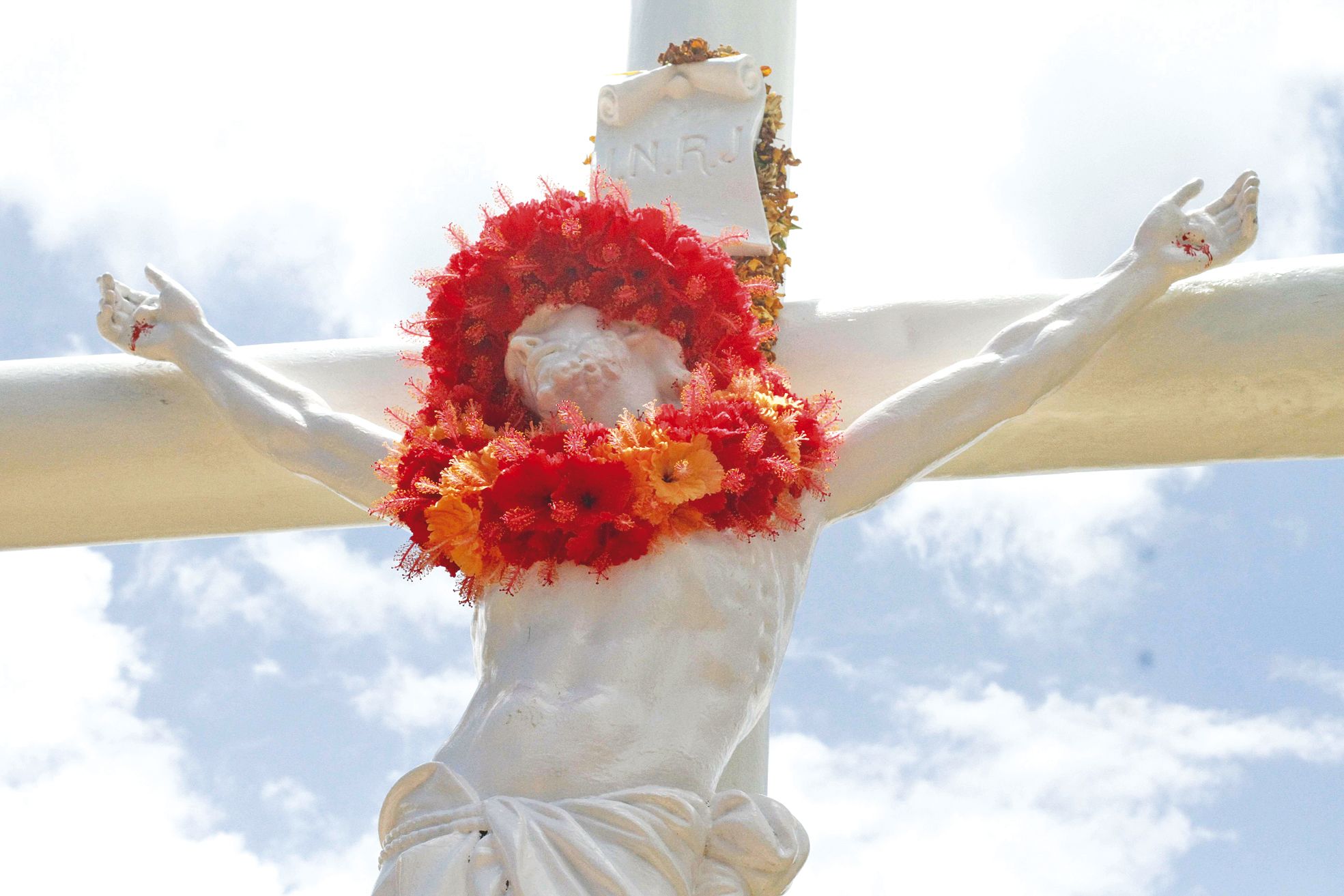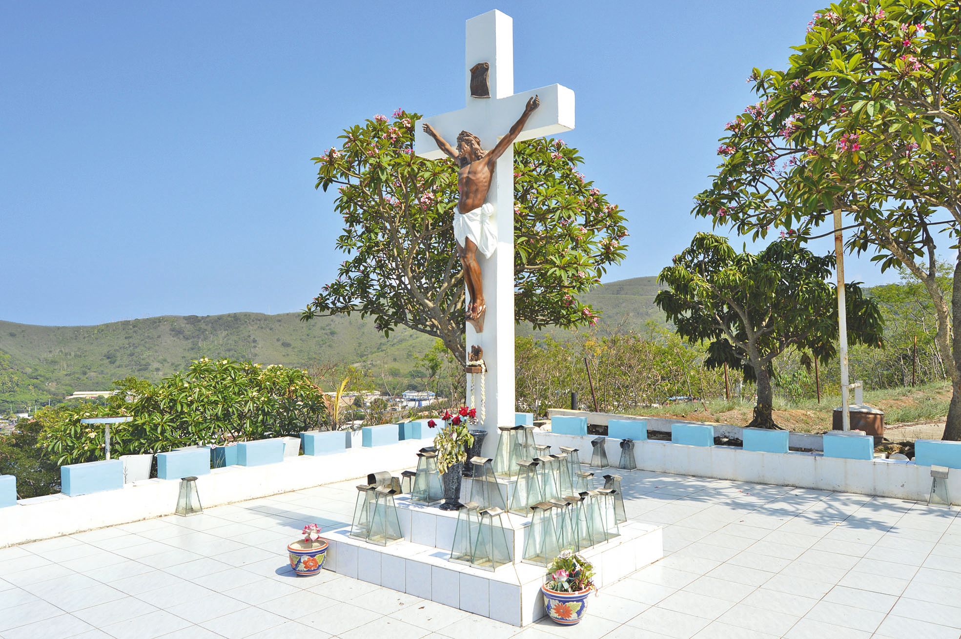 1 > Ce Christ sur sa croix, à l’entrée de la route de La Couvelée, à Dumbéa, a donné son nom au quartier voisin du Calvaire. Chaque jour, de belles couronnes de fleurs fraîches sont posées autour du cou et des pieds du supplicié. Parfois, le saint homme est même habillé de manous colorés.