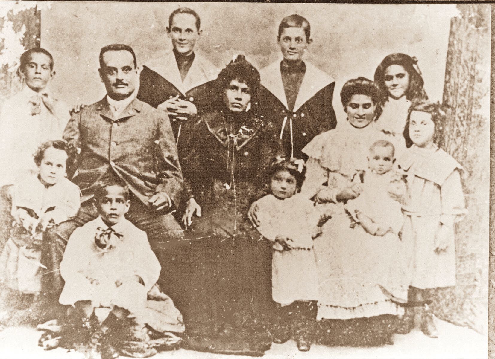 4 > Auguste fils et sa famille en 1909. Assis au centre Auguste, contre lui à gauche Alexandre et entre ses jambes Gustave ; assise à côté de lui, son épouse Marguerite Vray contre elle Maurice ; assise à côté de sa mère, Mélanie (épouse Péré puis Chapon) l’aînée qui tient sur ses genoux le petit dernier André, puis Marie-Louise (épouse David) debout tout à droite. Debout derrière leurs parents, Marcel, René, Jean et Marguerite (épouse Kabar puis Giozzi). Camille (1906-1908) n’est pas sur la photo.