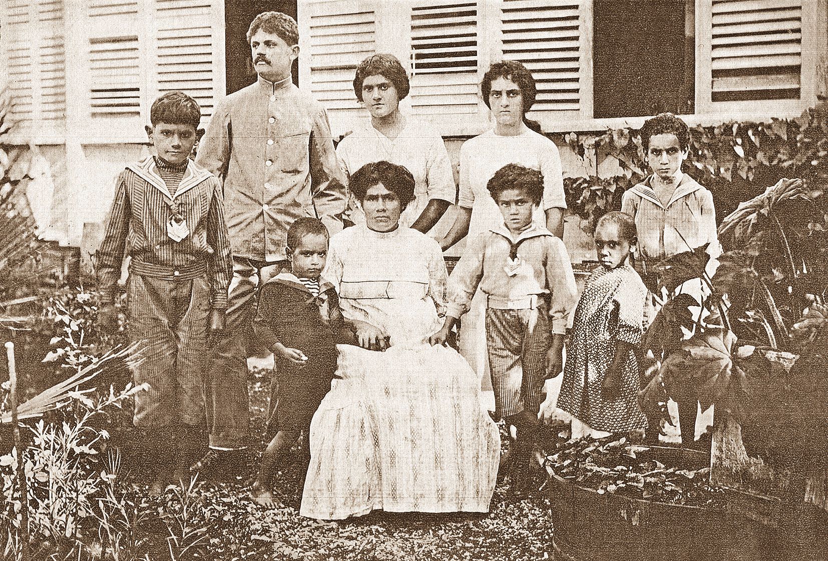 6 > Marguerite Bouteiller et ses enfants vers 1914-1915. Debout de gauche à droite : Alexandre, Raoul Désiré Kabar, Marguerite, Marie-Louise et Maurice. Au premier rang, Loulou et sa grand-mère Marguerite Vray-Bouteiller, André et une jeune voisine Néo-Hébridaise.