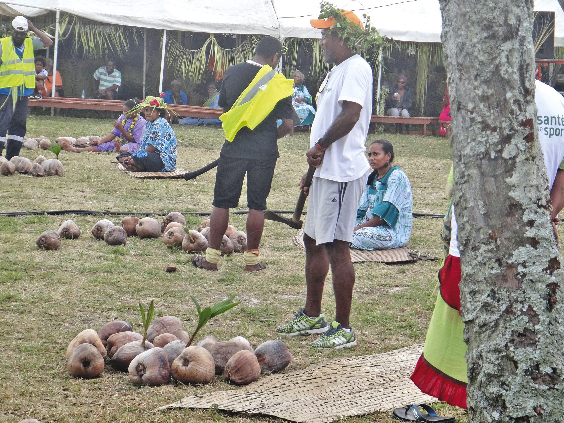 5 > Plusieurs concours ont été mis en place. Ici, le jeu consiste à décortiquer quinze cocos. L’Acaf (Association calédonienne pour l’animation et la formation) a proposé des activités pour les plus jeunes et a organisé les concours de miss et missette. L’événement a été aidé financièrement par la province des Îles Loyauté, la commune d’Ouvéa, l’association Eljo, le Syndicat d’initiative d’Iaai, Loyalty Tour et le magasin Bunaca.