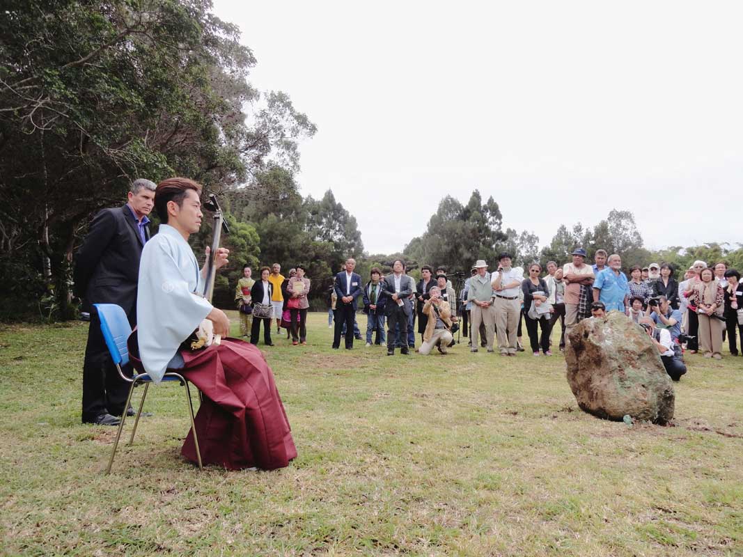Après une cérémonie œcuménique mêlant le père Jean à deux moines bouddhistes, les joueurs de shamisen (guitare japonaise) ont clos la pose de la première pierre . ; le 07/06/2012 - 03:02Après une cérémonie œcuménique mêlant le père Jean à deux moines bouddhistes, les joueurs de shamisen (guitare japonaise) ont clos la pose de la première pierre .Photo
