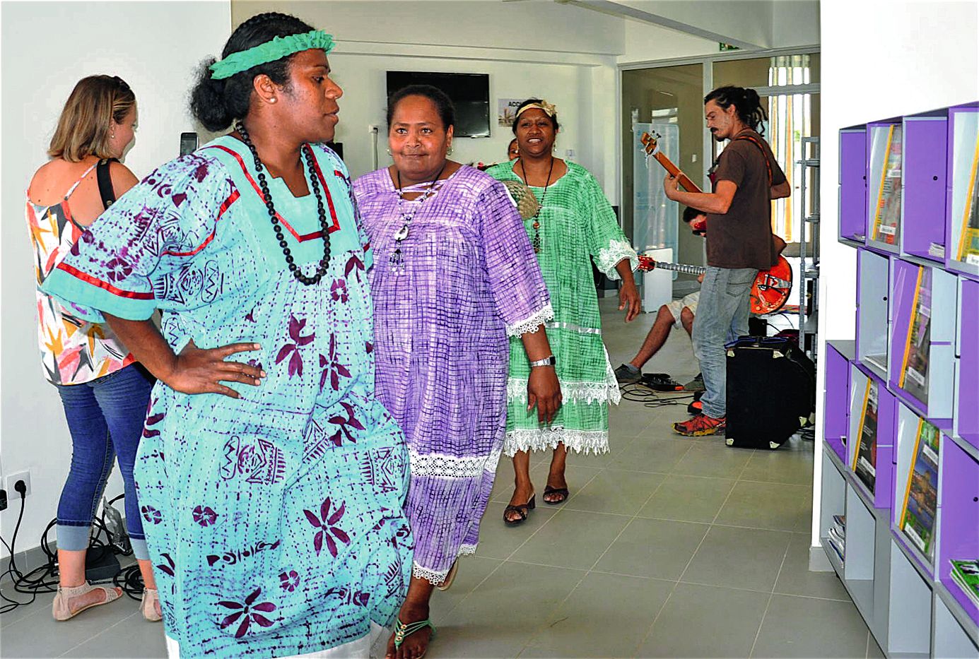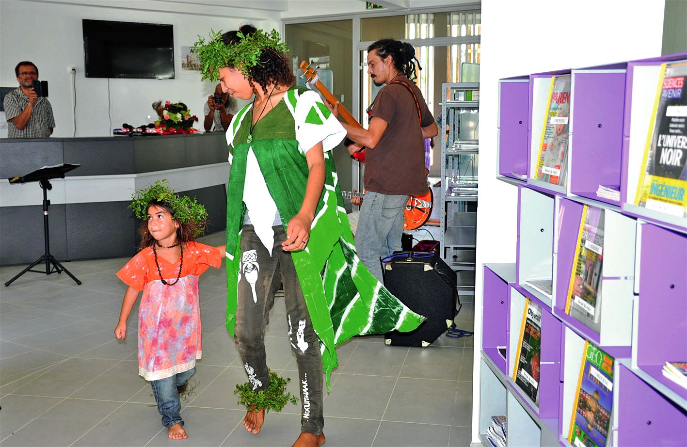 A gauche, des élèves de 5e du collège de Koumac ont lu quelques courts poèmes de leur création. A droite, des enfants des cycles 2 et 3 de l’école Punyi, tribu de Wanap, encadrés par Yoan Whaap, musicien intervenant de l’école de musique du CMDNC, ont int