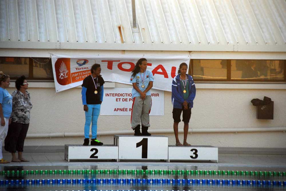 La relève se montre ; le 06/26/2011 - 21:46Si les cadres tels qu'Armelle Hidrio (au centre), six fois championne de Calédonie ce week-end, ont tenu leur rang, bon nombre de jeunes nageurs les ont suivis sur les podiums (ici, Déborah Cronsteadt et Annabelle Wane sur le 100m dos).