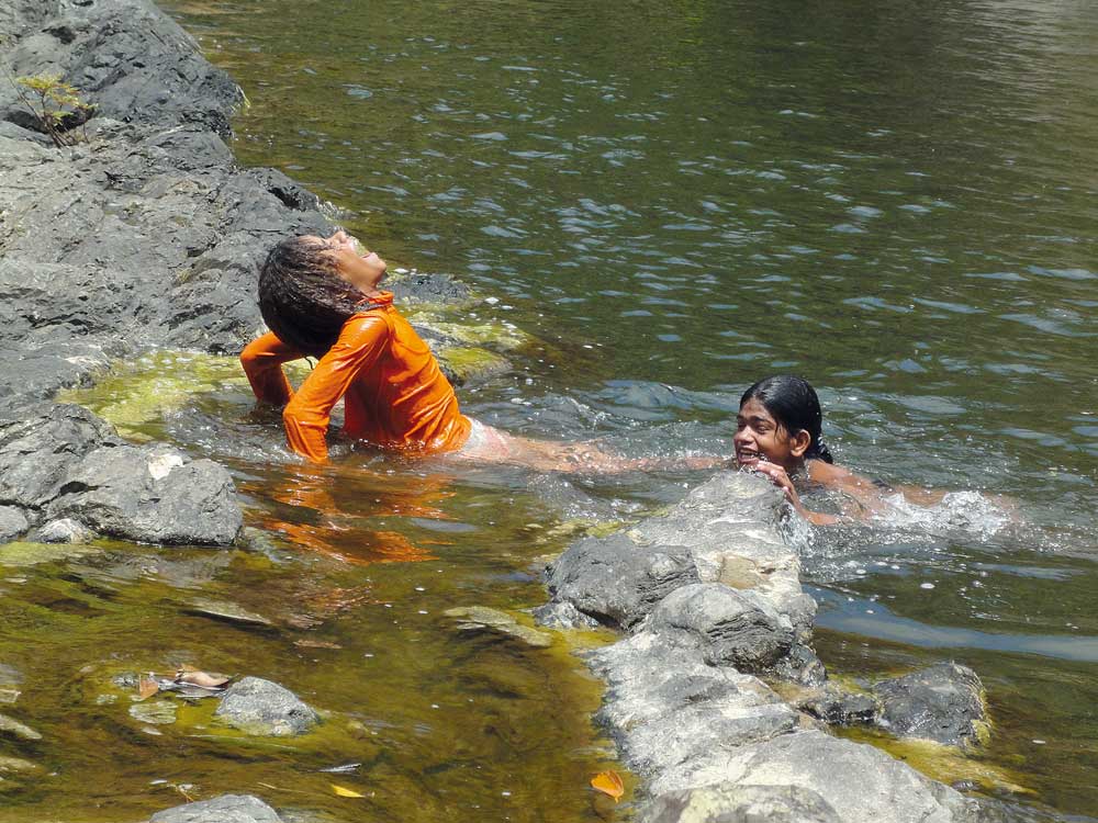 Après une petite marche, l'eau fraîche de la rivière est appréciée. Moment idyllique avec les rires des enfants comme seul bruit de fond.
