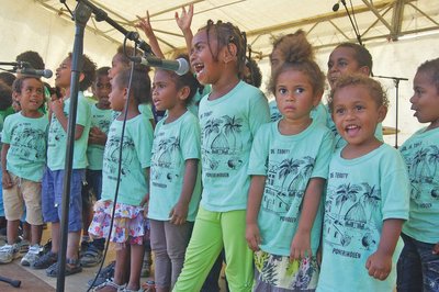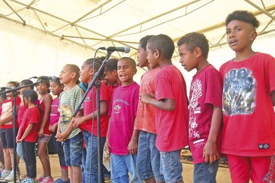 Chant des élèves de CE2 de l’école publique du village. Dans son discours d’ouverture, le maire, Pierre-Chanel Tutugoro, a fixé l’esprit de la fête en citant des propos de Jean-Marie Tjibaou et en concluant : « Nourrissons-nous de nos histoires puis de nos différences et cultivons le partage de nos savoirs puis de nos traditions afin que le pays que nous souhaitons construire ensemble soit plus juste et plus solidaire ».