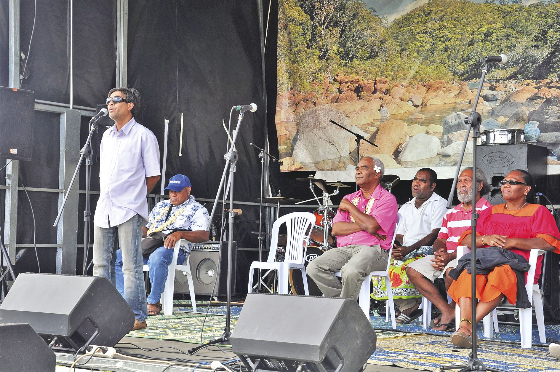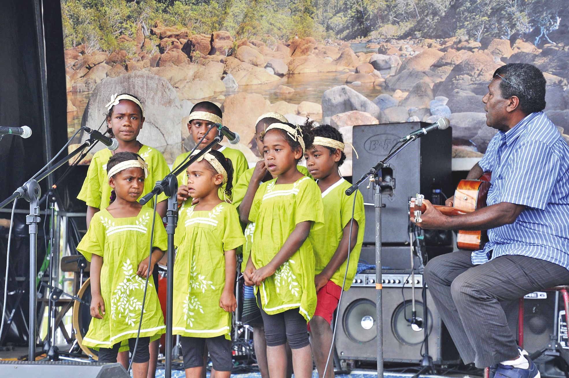 Lors de chaque fête, un podium libre permet à tous de s’exprimer sur scène. Raphaël Wayenece, président des Bahais de Maré, accompagne ici une chorale d’enfants de l’île.