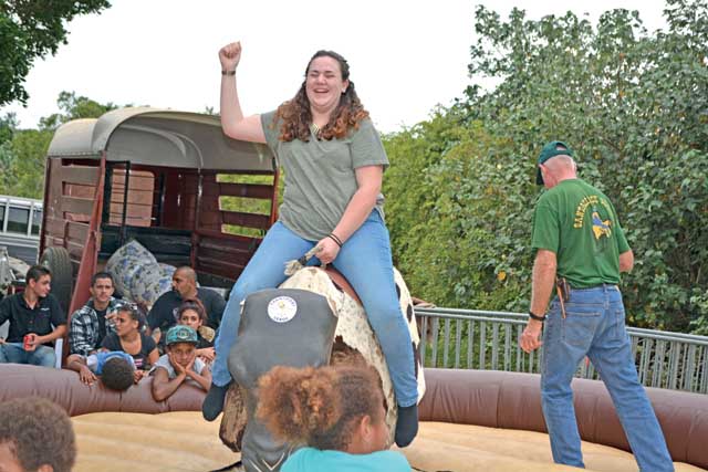 À l’image de cette jeune fille, adultes et enfants ont pu s’essayer au rodéo, grâce au taureau mécanique présent sur le site. Une animation qui a eu un succès fou.