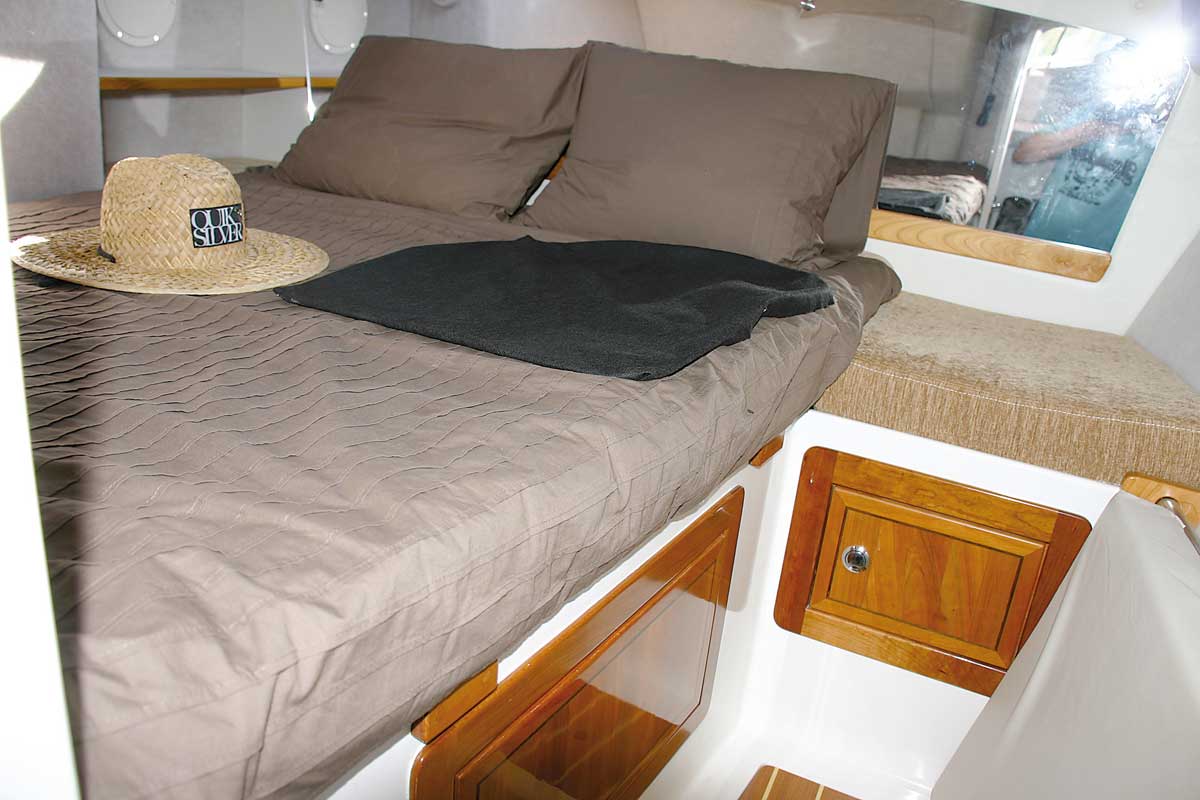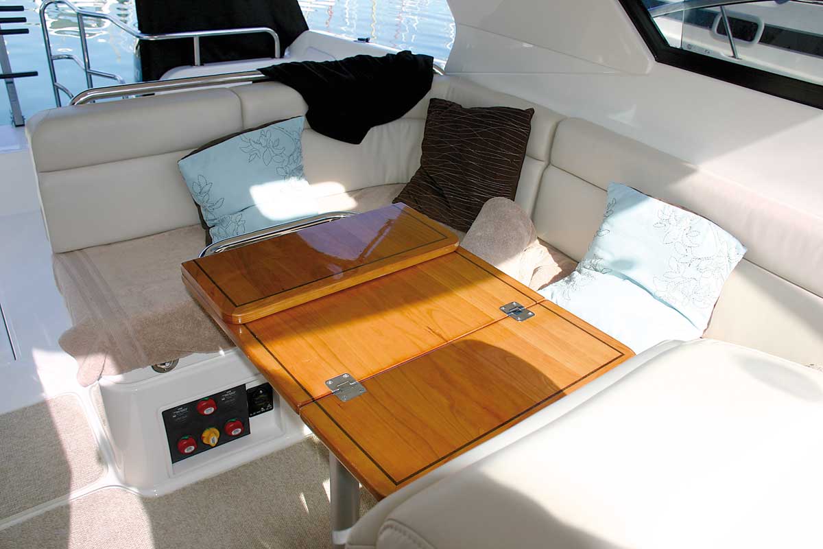 Le salon du carré principal est transformable en lit à deux places. Il peut être entièrement fermé à l'aide de bâches pour être séparé du cockpit.