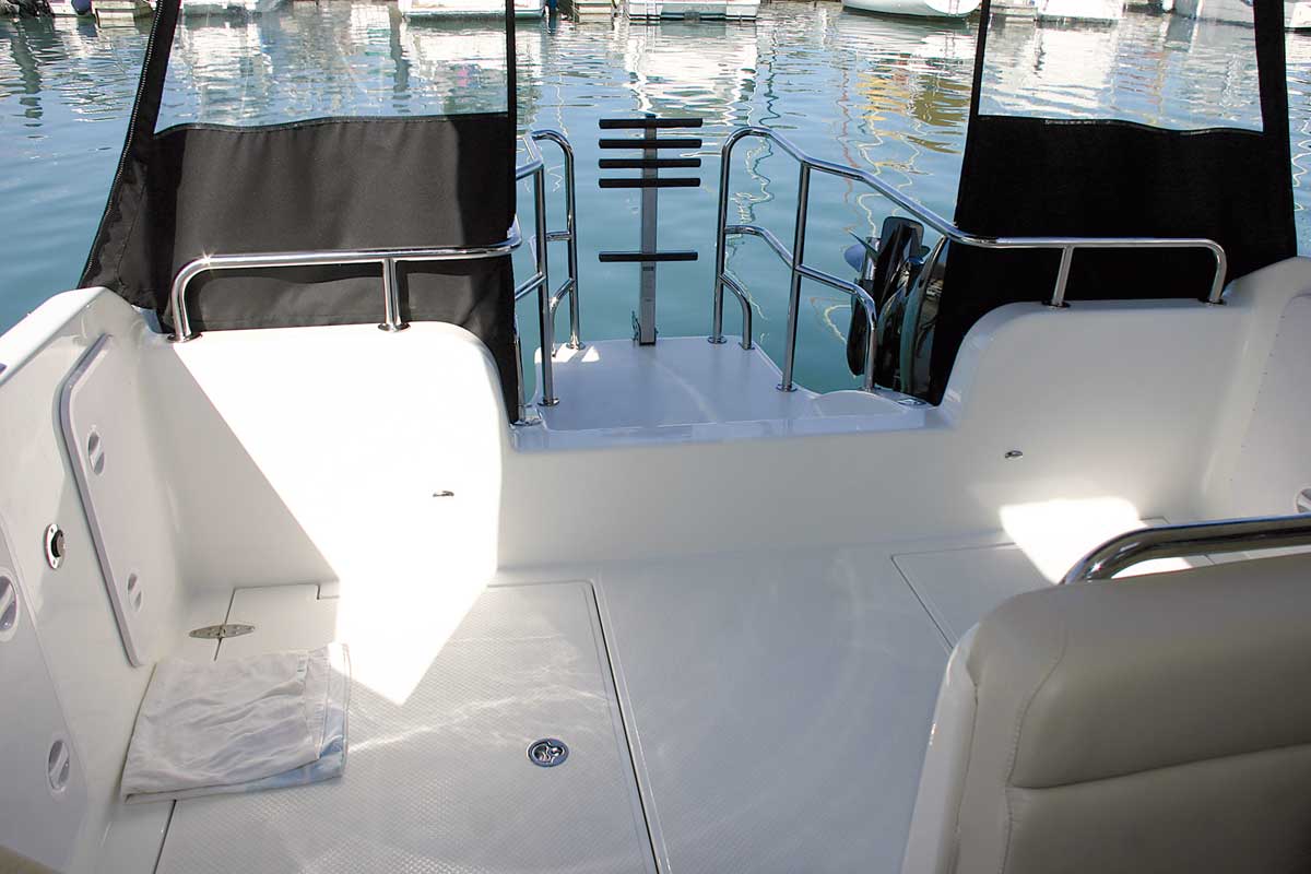 Le cockpit est spacieux et doté de deux grands coffres de rangement étanches. A noter, l'accès privilégié à l'échelle de bain télescopique, avec ses deux garde-corps sécurisants.