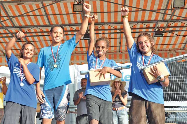 « On a eu des beaux matches. On a assisté à une finale particulièrement serrée remportée par l’équipage de Hienghène, c’est le fruit de la persévérance. C’est un équipage qui vient depuis qu’il fréquentait la classe de 6e. Ils ont travaillé, ils ont progressé d’année en année. Aujourd’hui, ils ont la victoire », a déclaré Laurence Bouchet, responsable des événements nautiques au CNC. De gauche à droite : Chloée Poudewa (skipper), François Gboyah, Doria Kapona et Quentin Monpert.