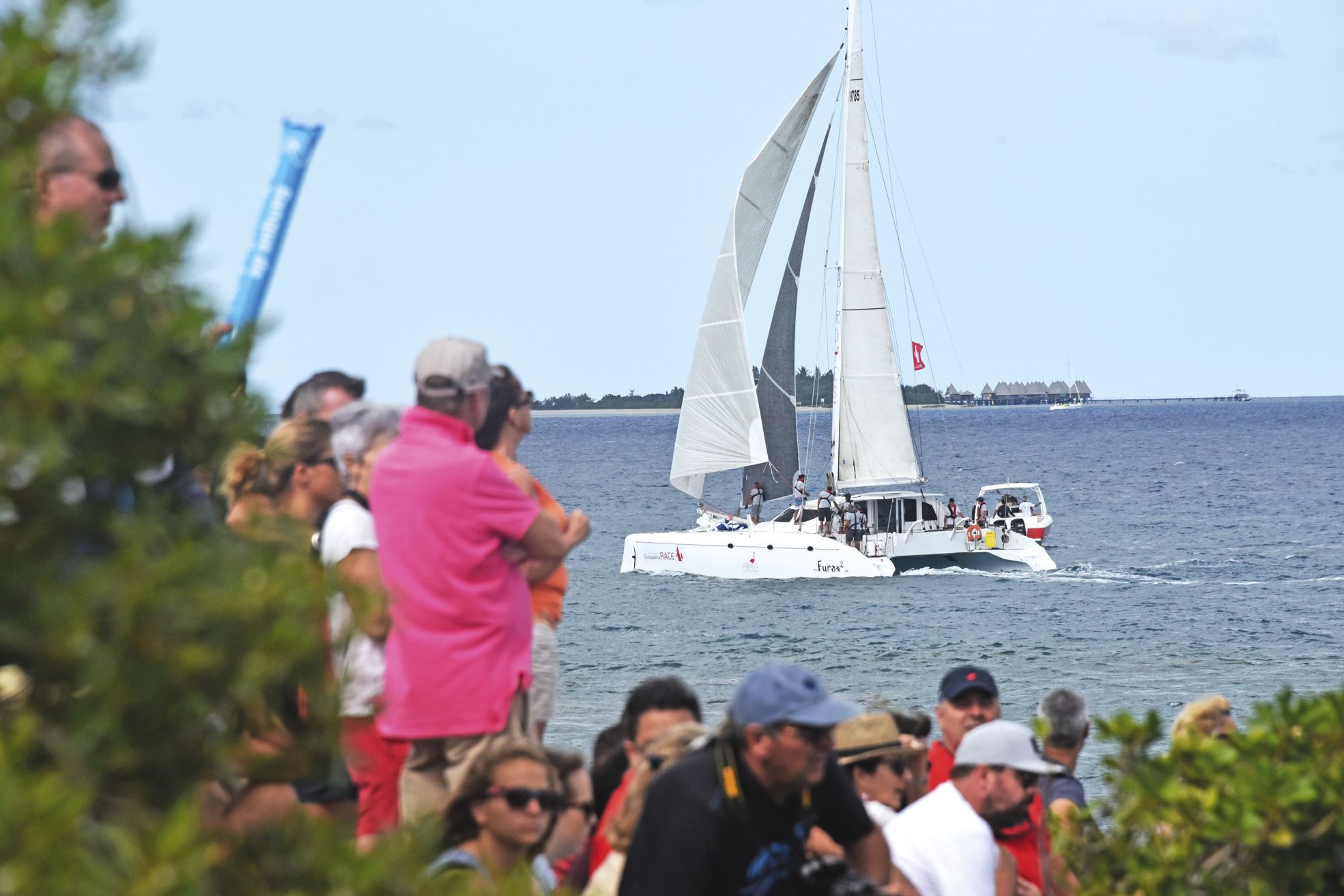 Dès 8 heures du matin, le rocher à la Voile a été pris d’assaut par près de 1 000 personnes venues voir le départ. On pouvait aussi compter une centaine de bateaux au mouillage entre la baie des Citrons et l’île aux Canards.