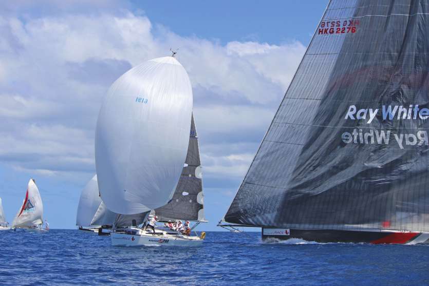 Sur la ligne de départ, la flotte calédonienne paraissait minuscule face à ces géants venus de l’étranger. Ici, Boulègue-Pao prod, le troisième plus petit bateau de la course, se fait rattraper par le plus gros bateau de la Groupama Race, Scallywag (à droite).